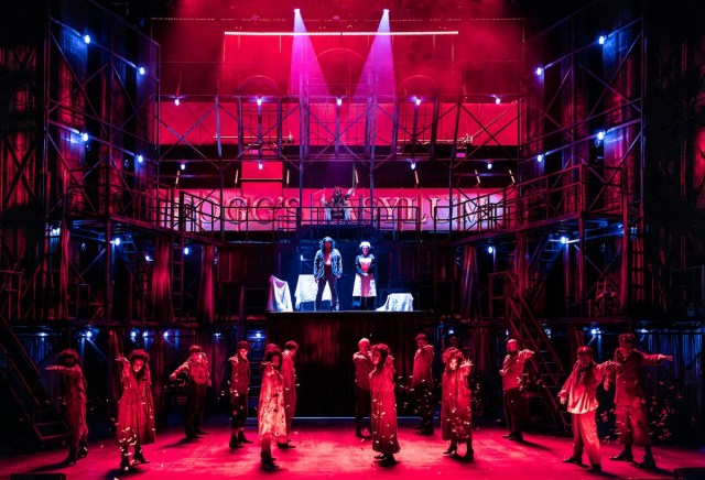 Darryl Archibald’s orchestra pulsates with stirring melodies one moment and frightening cacophony the next—the organ and steam whistle will haunt your dreams. Paul Tate dePoo III’s set, a grouping of compartments separated by curtains, is reminiscent of Dario Argento’s Suspiria, where evil hides behind each gossamer cloth. Kate Bergh’s costumes are so effectively worn through that one can almost smell their rankness. Jared Sayeg lighting uses crimson washes and lightbulbs to evoke visual horror.