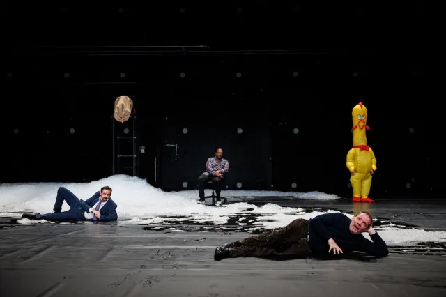 Fish’s other directorial flourishes (at one point an actor appears in an inflatable chicken suit) are more baffling, but at least they provide comic relief to an otherwise grim discussion.