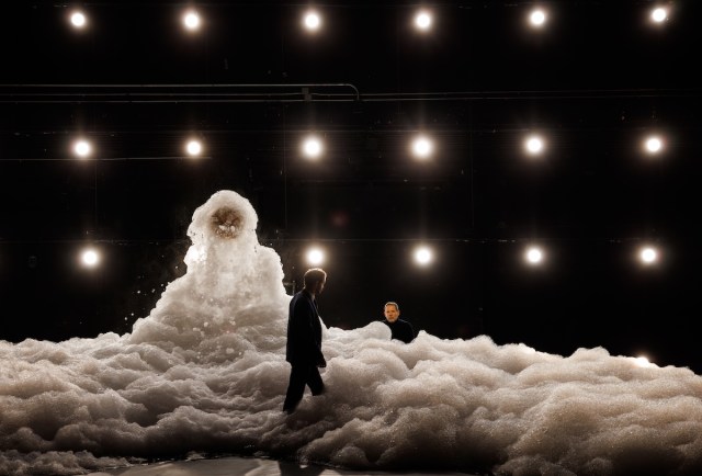 Fish gives us space to contemplate with an extended interlude, during which a machine spews soap suds, creating a mountain of lather that expands across the empty stage (this is the largest element of the otherwise minimal scenic design by Jim Findlay, Josh Higgason, and Amy Rubin). Brill and Ryan trudge through the bubbles as they debate, their costumes dampening (Terese Wadden outfits Fauci in an inexpensive business suit, while the navy sweater she has selected for Kramer gives him a monkish quality). The fluffy creeping metaphor slowly dissolves throughout the second half of the play, leaving Kramer to angrily mop up what’s left.