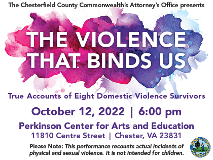 Over the course of two years, W&L Theater Professor Dr. Stephanie Sandberg interviewed eight domestic violence survivors. This theatrical performance features the voices of those survivors as portrayed by Project Horizon staff. The words spoken by the cast are all direct quotes from the interviews. The questions spoken between each act are from the Danger Risk Assessment developed by Jacqueline Campbell, PhD, MSN, RN at Johns Hopkins University School of Nursing.